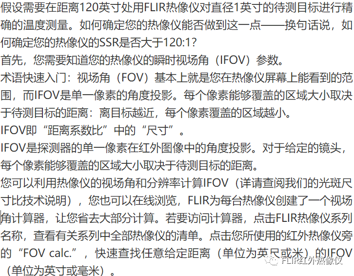 我們得到的距離系數(shù)比為120:0.31。簡而言之,0.31英寸大約為1英寸的1/3,因此該計(jì)算結(jié)果得出的結(jié)論就是:該熱像儀能夠在120英寸遠(yuǎn)的距離測量1/3英寸的物體。