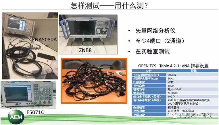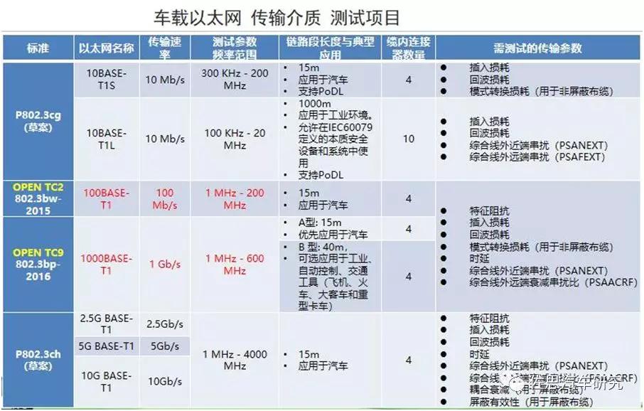 無論國內(nèi)或者國外,目前正在采用的,以及即將要進入批量使用的是百兆或者千兆,而千兆是市場發(fā)展方向。涉及到的測試參數(shù),第一,因為這里采用的是單線對的傳輸介質(zhì),所以它的測試參數(shù)比我們采用四線對的要少。第二,支持千兆比特每秒的物理帶寬,頻率到600赫茲。目前國際上最高銅纜介質(zhì)的傳輸帶寬已經(jīng)到2G赫茲。因此,從它的頻率來講,并不是非常高,也就是說測試難度并不是很大。如果從通信行業(yè)來比對,屬于中下端的技術(shù)水平,但對于汽車行業(yè)來說已經(jīng)足夠了,甚至說有點超前,所以,它的測試難度并不大。