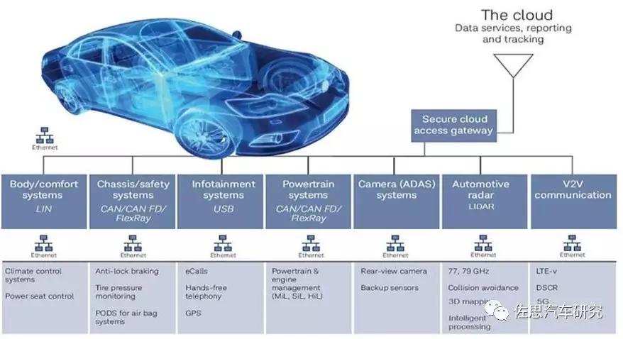 這張圖來源于互聯(lián)網(wǎng),我借用了這張圖,它顯示了目前傳統(tǒng)的汽車內(nèi)部傳輸介質(zhì)的應(yīng)用,都有被車載以太網(wǎng)技術(shù)所取代的趨勢。這里面包括車身與舒適系統(tǒng)(包括座椅的加熱、溫度的調(diào)節(jié)等),底盤安全系統(tǒng),信息娛樂系統(tǒng),動力和傳動系統(tǒng),高級駕駛輔助系統(tǒng)等。這些所有的信息或者信號系統(tǒng)之間的互聯(lián)互通,目前所采用的總線都有改變?yōu)橐蕴W(wǎng)的趨勢。