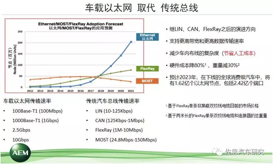 傳統(tǒng)的汽車總線用的非常好,為什么會被以太網(wǎng)技術(shù)所取代呢?我個人認為有兩大驅(qū)動力,第一是成本。大家可以看到,采用以太網(wǎng)技術(shù)的線束或者是車內(nèi)布線,它的復(fù)雜度會降低,線束的數(shù)量會減少,所節(jié)約下來的無論是硬件成本還是人工成本,都是非常顯著的。數(shù)量減少以后,線束的總重量也會降低。這里有兩個量化數(shù)據(jù),一個是硬件成本降80%、一個是重量減30%,兩個數(shù)據(jù)分別來自于兩個技術(shù)報告,也是來自于互聯(lián)網(wǎng)。第二個驅(qū)動力是技術(shù)層面,車載以太網(wǎng)技術(shù)能夠提供更高的傳輸速率。